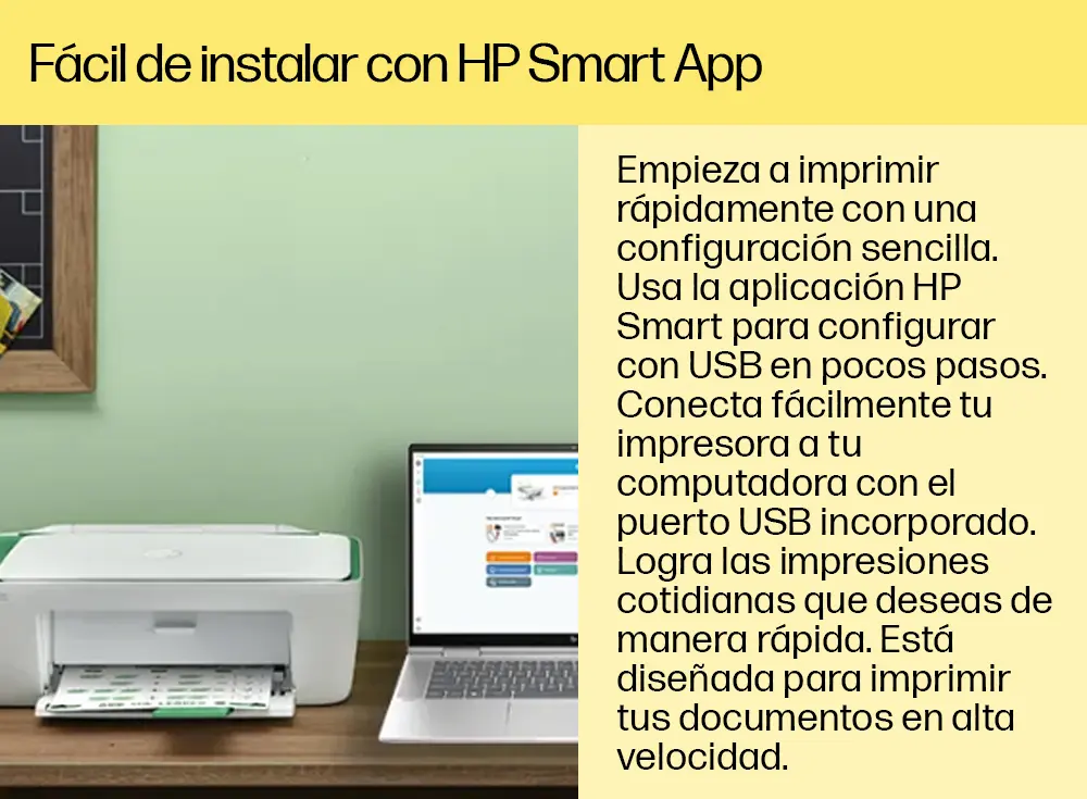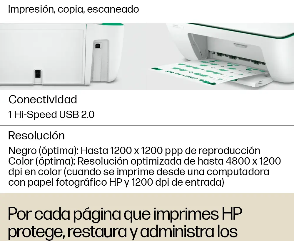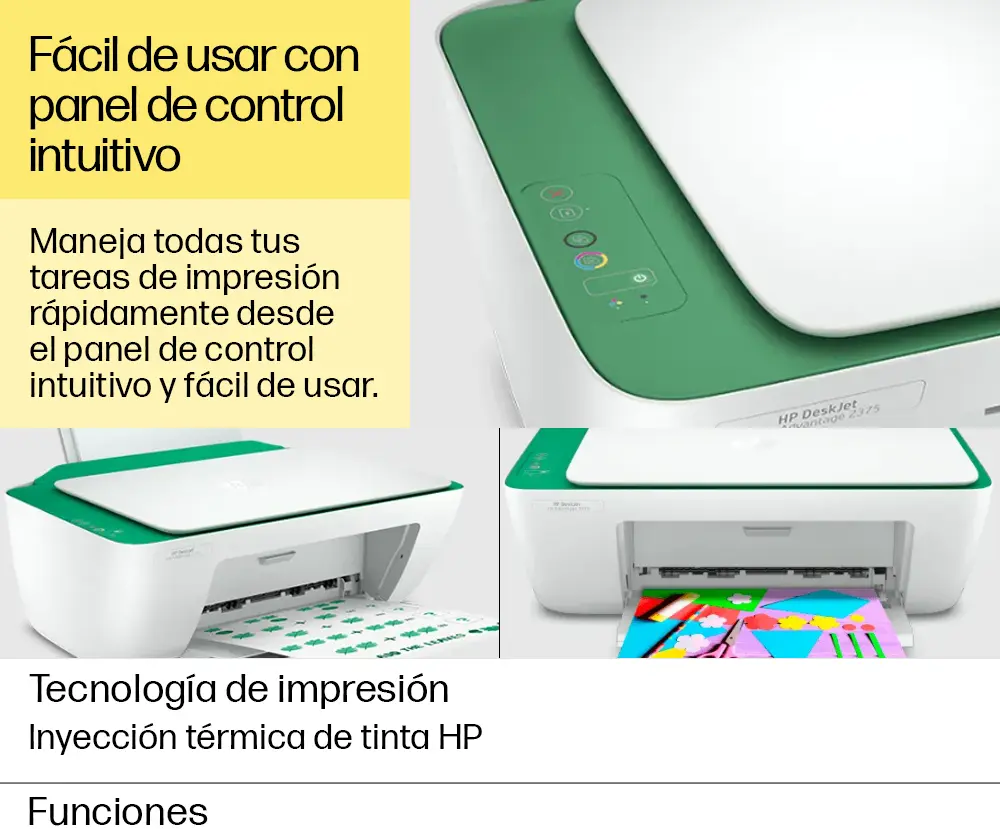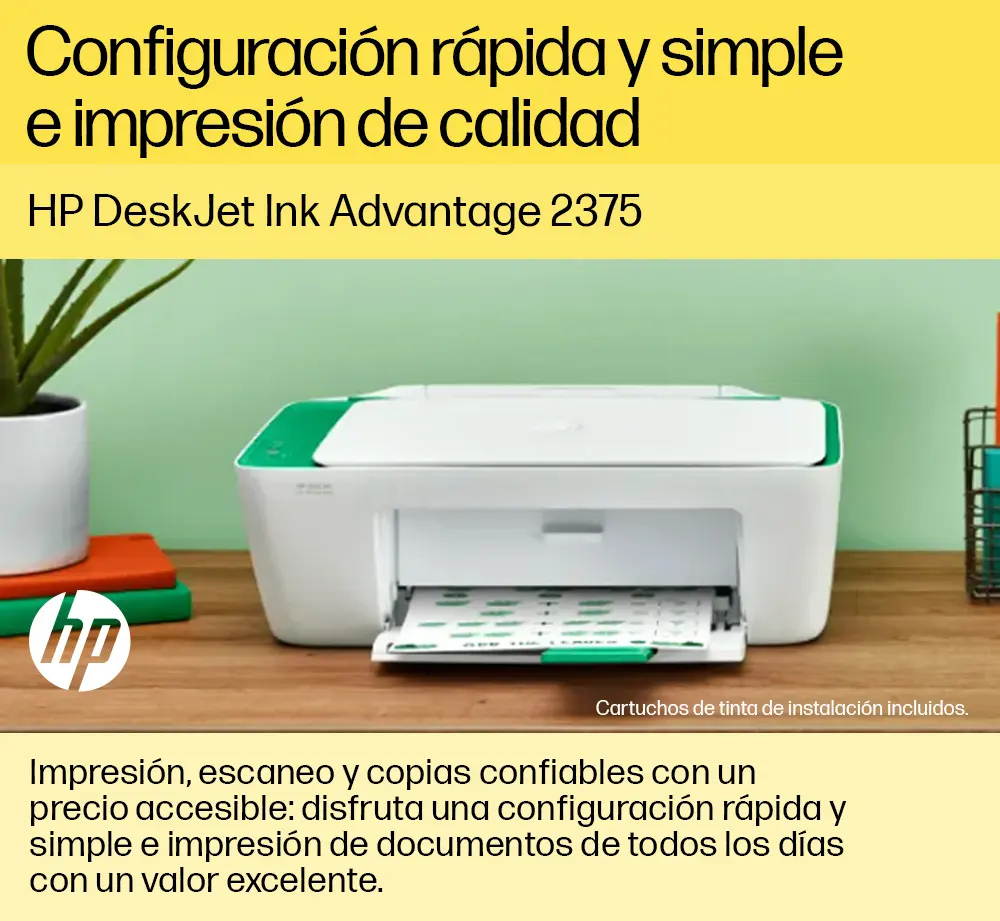 Impresora Todo-en-uno HP Deskjet Ink Advantage 2375 (7WQ01A) Conecte e imprima, escanee y copie. La forma simple de obtener lo esencial. Con la configuración impecable desde la PC e impresión confiable, usted puede satisfacer sus necesidades de impresión, escaneo y copia con esta impresora asequible. Use la aplicación HP Smart para obtener configuración sencilla y está listo. HÁGALO TODO CON UN PRECIO ECONÓMICO • Obtenga un rendimiento versátil: imprima, escanee y copie. • Cuente con impresiones de alta calidad todo el tiempo, gracias al proveedor de impresoras Nº 1 del mundo. • Los productos HP funcionan mejor juntos para brindar una experiencia de impresión óptima. Especificaciones técnicas - Funciones: Impresión, copia, escaneado - Velocidad de impresión Negro (ISO): Hasta 7,5 ppm; Color (ISO): Hasta 5,5 ppm; Impresión de la primera página en negro: 15 segundos; Impresión de la primera página en color: velocidad máxima de 18 segundos; Negro (borrador): Hasta 20 ppm; Color (borrador): Hasta 16 ppm - Resolución de impresión Negro (óptima): Hasta 1200 x 1200 ppp de reproducción; Color (óptima): Resolución optimizada de hasta 4800 x 1200 dpi en color - Tecnología de impresión: Inyección térmica de tinta HP - Cantidad de cartuchos de impresión: 2 (1 negro, 1 tricolor) - Impresión sin bordes: No - Lenguajes de impresión estándar: HP PCL 3 GUI - Funciones del software inteligente de la impresora: Impresión manual a dos caras - Tipo de escaneo/tecnología: Cama plana (CIS) Sensor de imagen de contacto - Resolución de escaneado: Hardware: Hasta 1200 x 1200 ppp; Óptica: Hasta 1200 ppp - Formato del archivo de digitalización: JPEG, TIFF, PDF, BMP, PNG - Modos de entrada de digitalización: Escaneo en el panel frontal - Tamaño máximo de escaneado: 216 x 297 mm - Profundidad de bits/niveles de escala de grises: 24 bits/256 - Velocidad de copia Negro (ISO): Hasta 6 cpm; Color (ISO): Hasta 3 cpm - Resolución de copia Negro (texto y gráficos): Hasta 600 x 300 ppp; Color (texto y gráficos): Hasta 600 x 300 ppp - Número máximo de copias: Hasta 9 copias - Configuraciones de copia: Ampliación automática - Conectividad estándar: 1 Hi-Speed USB 2.0 - Capacidades de red: Ninguno/a - Capacidad inalámbrica: No - Capacidad de impresión móvil: No se admite impresión móvil - Memoria Estándar: Memoria integrada - Ciclo de trabajo mensual, A4: Hasta 1000 páginas - Volumen de páginas mensuales recomendado: 50 a 100 - Tipos de soporte admitidos: Papel común, papel fotográfico, papel para folletos - Peso de soporte admitido A4: 60 a 90 g/m2; Sobres HP: 75 a 90 g/m2; Tarjetas HP: hasta 200 g/m2; Papel fotográfico HP de 10 x 15 cm: hasta 300 g/m2 - Tamaños de soportes de impresión admitidos: A4; B5; A6; Sobre DL - Tamaños de soportes personalizados: 89 x 127 a 215 x 279 mm - Manejo de papel: Capacidades de entrada: Hasta 60 hojas estándar; Hasta 5 sobres; Hasta 20 tarjetas; Hasta 10 hojas etiquetas; Hasta 60 hojas oficio. Capacidades de salida: Hasta 25 hojas estándar - Opciones de dúplex: Manual - Alimentador de sobres: No - Bandejas de papel estándar: 1 Contenido de la caja - 7WQ01A Impresora Todo-en-uno HP Deskjet Ink Advantage 2375; - Cartucho inicial HP 667 Negro; Cartucho inicial HP 667 Tri-color; - Guía de referencia, guía de instalación; - Cable de alimentación; - NO INCLUYE CABLE USB.